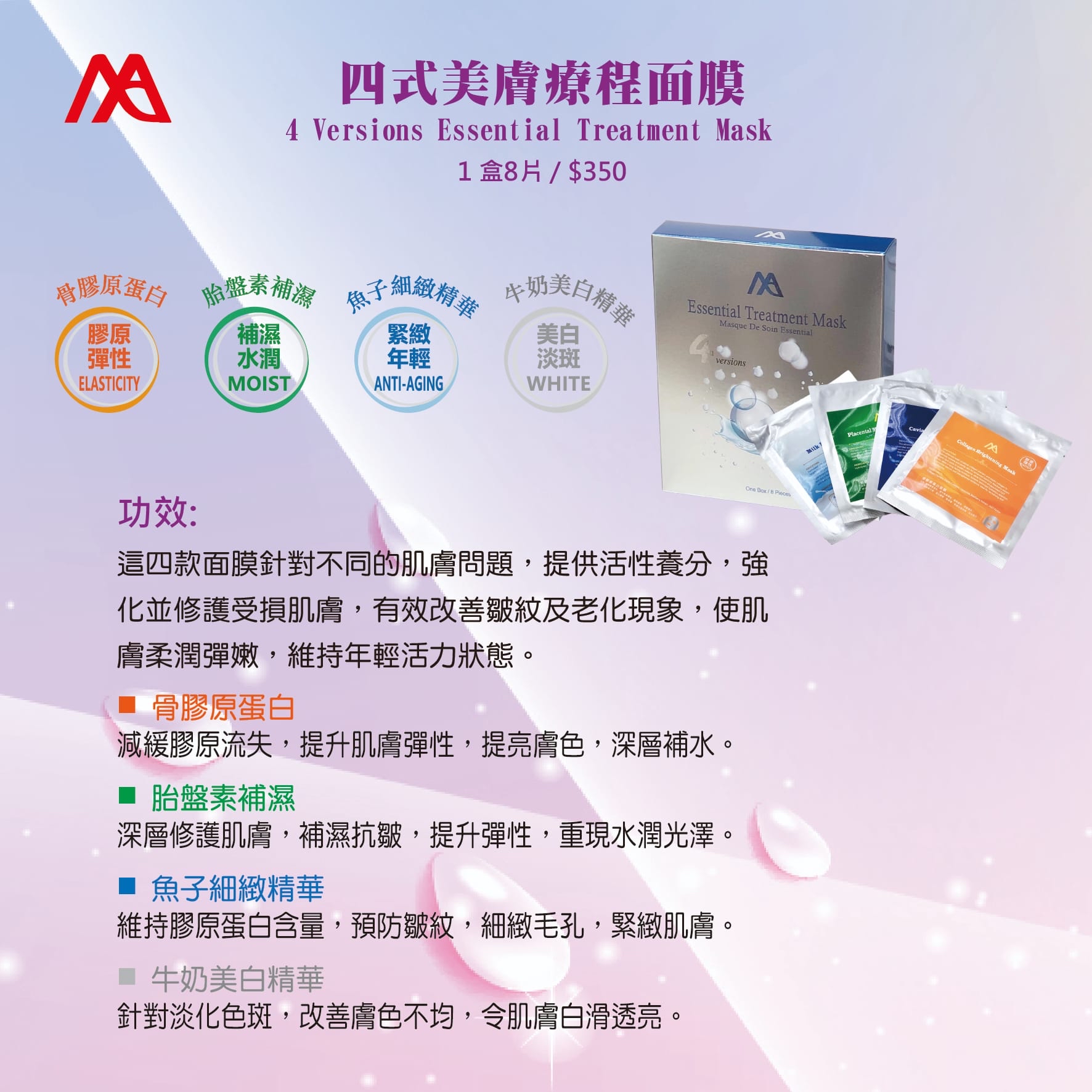 美膚四式療程面膜均取自天然草本植物,提供活性養分,美白補濕,強化及修護受損膚質,有效改善皺紋及老化現象,讓肌膚光滑富彈性。